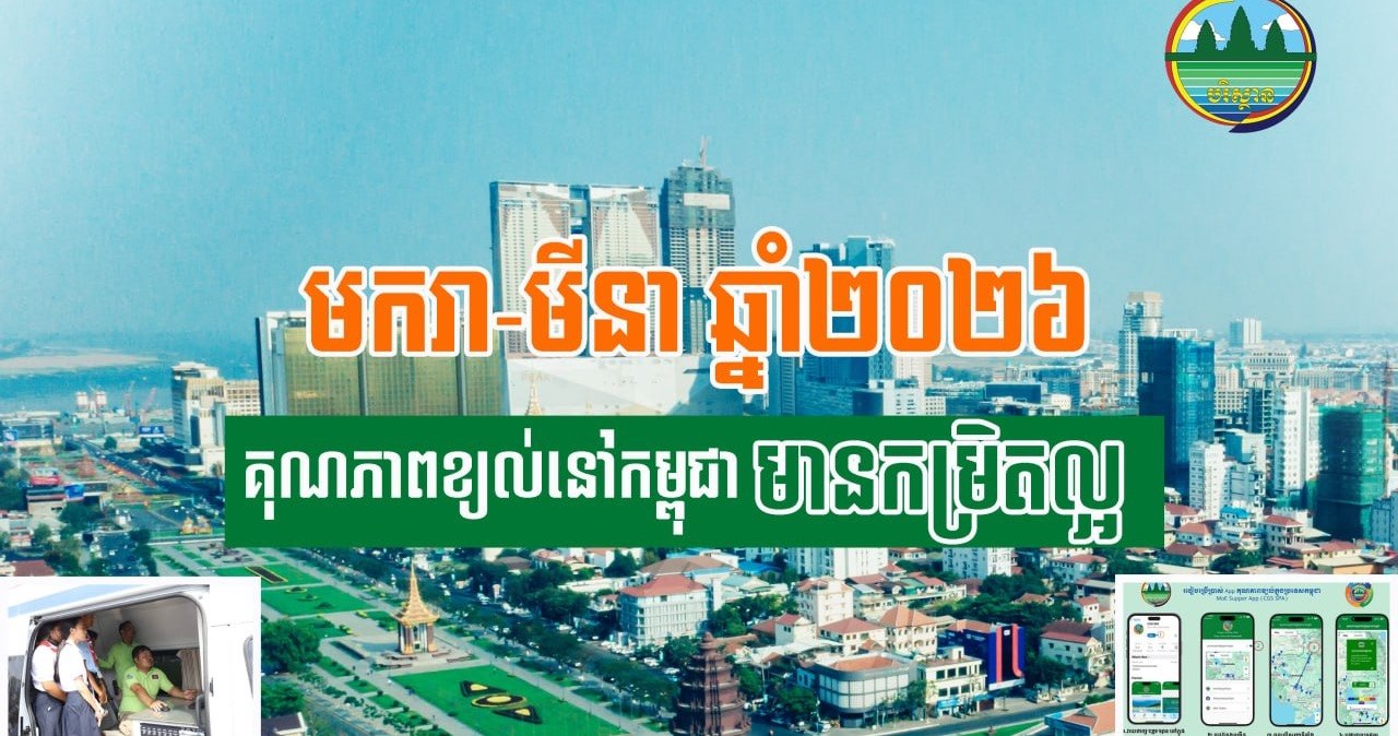 តាមរយៈការត្រួតពិនិត្យគុណភាពខ្យល់ពីឧបករណ៍ និងស្ថានីយ ដែលបានដំឡើងនៅ ទូទាំងប្រទេស ចំនួន ៥៩ទីតាំង (នៅរាជធានីភ្នំពេញចំនួន ១២ទីតាំង និងតាមបណ្ដាខេត្តទូទាំងប្រទេសចំនួន ៤៧ទីតាំង)បានបង្ហាញថា គុណភាពខ្យល់នៅរាជធានីភ្នំពេញ និងបណ្ដាខេត្ត ក្នុងត្រីមាសទី១ ឆ្នាំ២០២៦នេះ ស្ថិតក្នុងកម្រិតល្អបើធៀបទៅនឹងស្តង់ដាគុណភាពខ្យល់សាធារណៈ។
